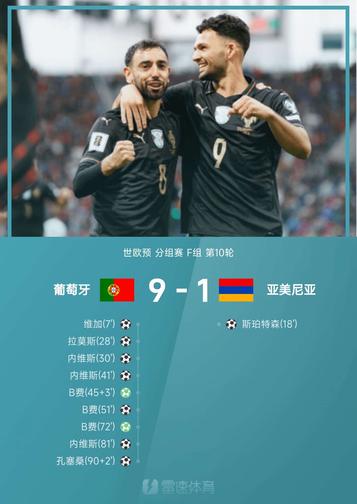 6686體育11月16日訊 26季世歐預分組賽F組第10輪,葡萄牙主隊場以9-1狂勝美尼亞。維加為葡萄牙閃擊,隨後斯珀特森為亞美尼亞扳平賽果分;接下來的競賽裡,葡萄牙隊有如神助,內維斯和B費相繼完成帽子戲法,拉莫斯送出傳射,孔塞桑為球隊錦上添花。葡萄牙以4勝1平1負13分,斬獲F組第一,直接獲得2026美加墨世盃賽的入場券。