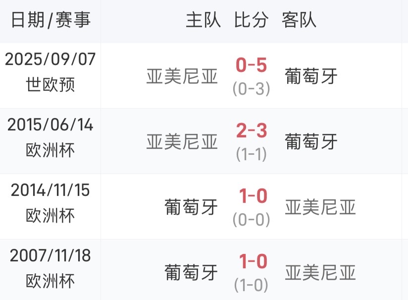 據統計,葡萄牙與亞美尼亞近四次交手,戰績為全勝。