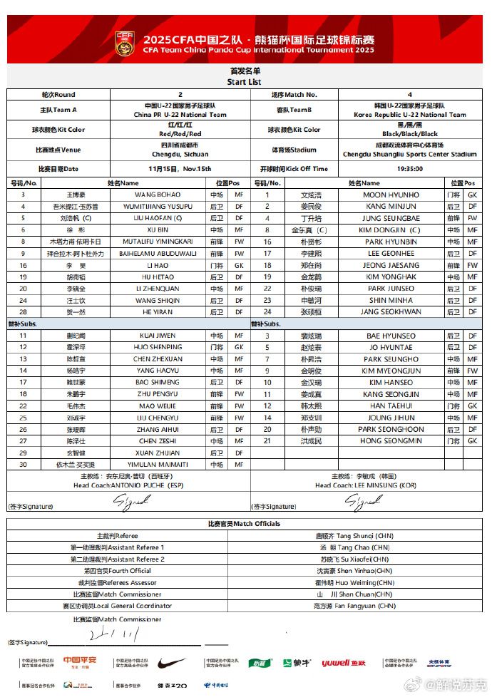 6686體育11月15日訊 北京時間今日,熊貓盃第二輪,國足U22對韓國U22,賽前雙方先發。