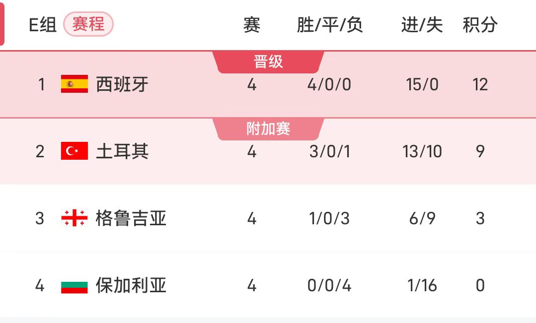 隨後進行的E組競賽中,西班牙將面對格魯吉亞,土耳其將迎戰格魯吉亞。目前領跑位3分的西班牙,若本輪取勝且土耳其未能全取三分球,也將提前一輪進軍美加墨。