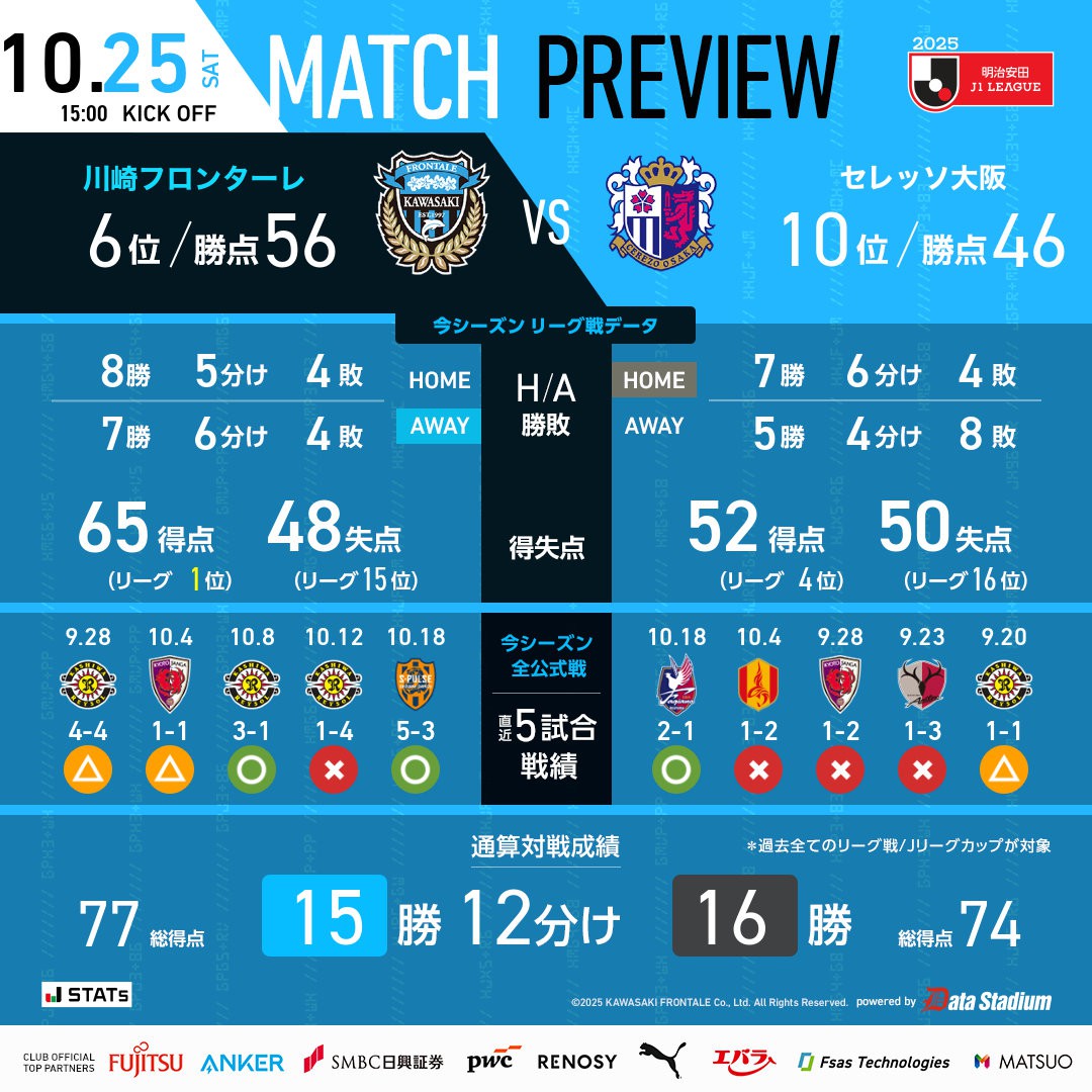 6686運動10月25日訊 日職聯第35輪,大阪川櫻花隊場迎戰川櫻族前鋒。