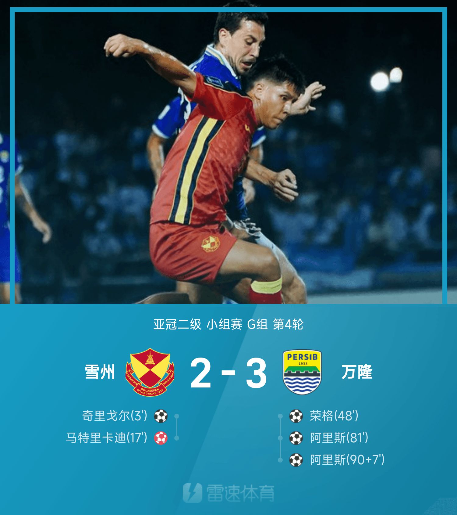 6686體育11月06日訊 25/26賽季亞冠二級分組賽G組第4輪,萬隆3-2戰勝雪州。上半場奇里戈爾開場3分鐘閃擊,馬特里卡迪清球變烏龍,下半場榮格破門扳回一球,阿里斯單刀扳平,補時最後時刻伊贊巨大差錯,阿里斯最後一投。