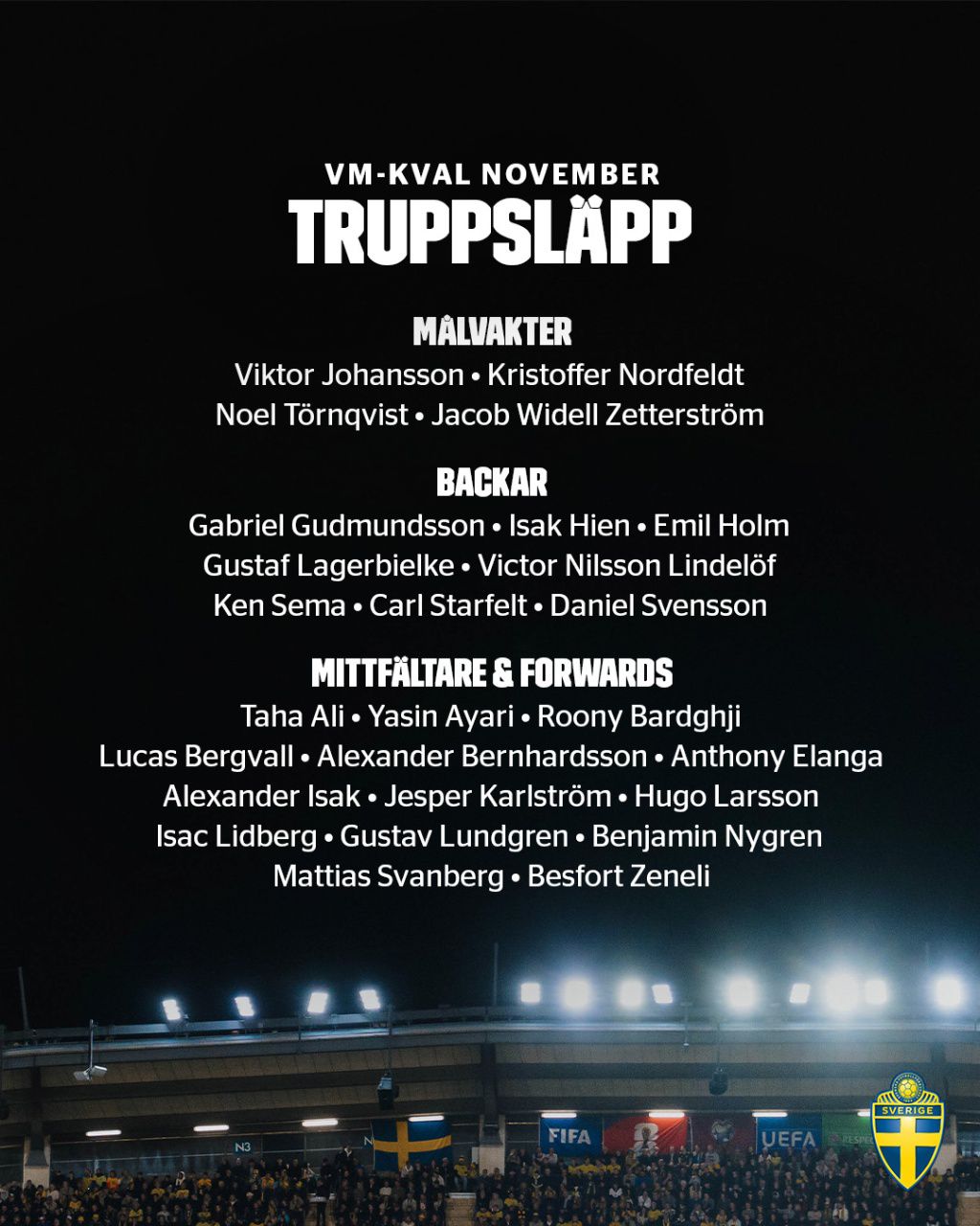 後防線:丹尼爾·斯文松(多特蒙德)、希恩(亞特蘭大)、古德蒙德森(利茲聯)、拉格比爾克(布拉加)、塞瑪(帕福斯FC)、霍爾姆(博洛尼亞)、林德洛夫(阿斯頓維拉)、斯塔費爾特(塞爾塔)