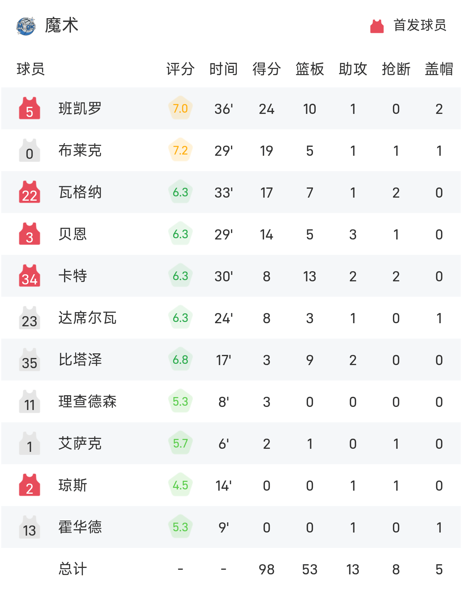 雙方全場戰罷,魔術98-110不敵公牛。