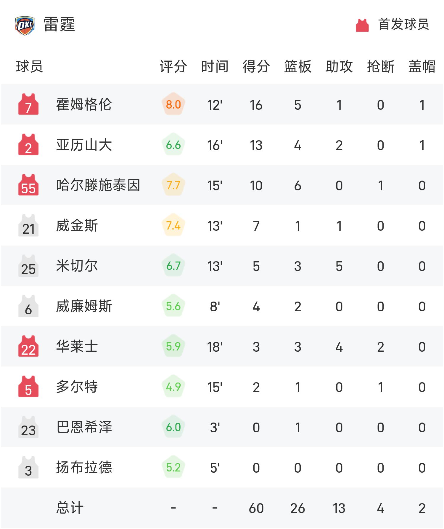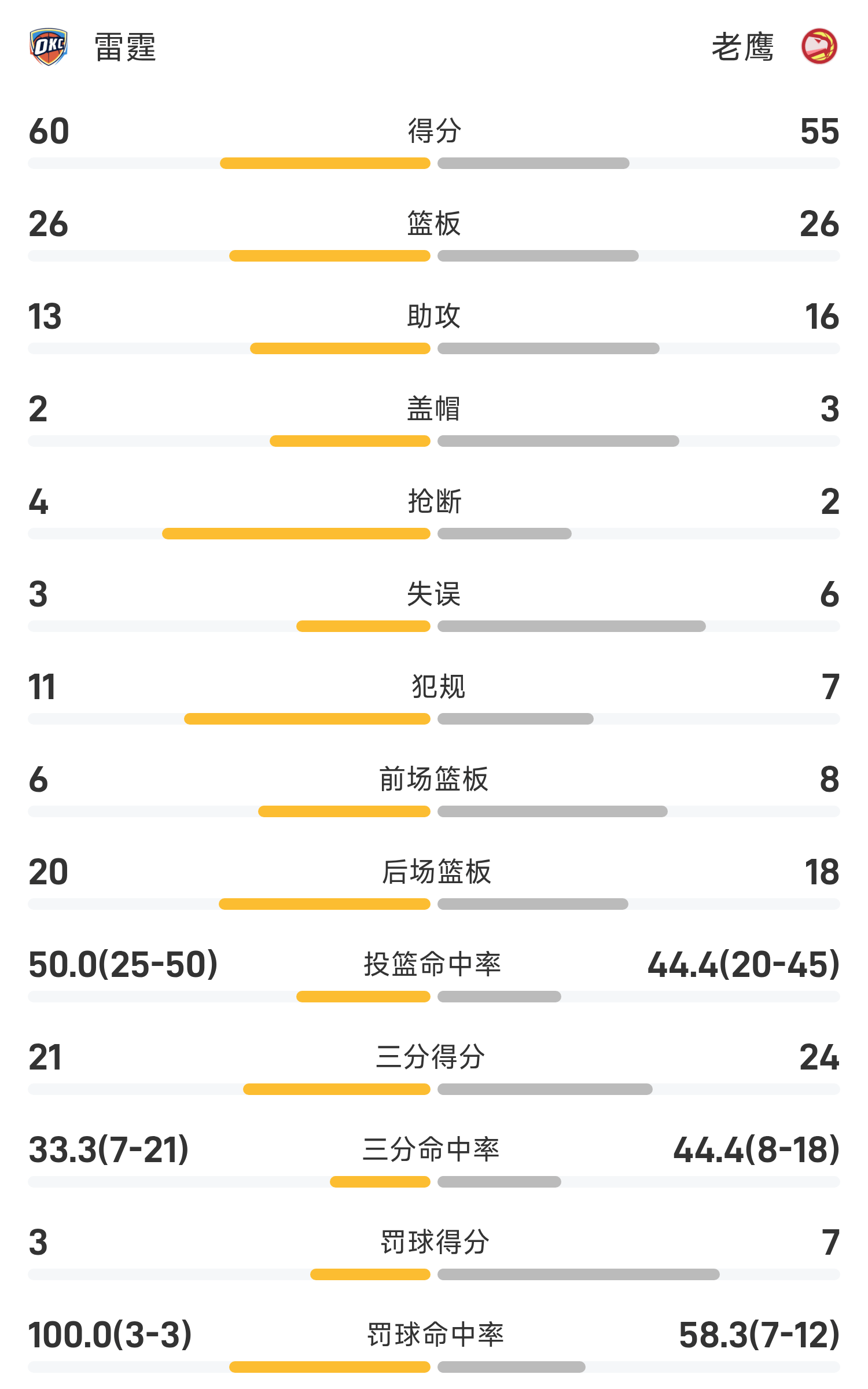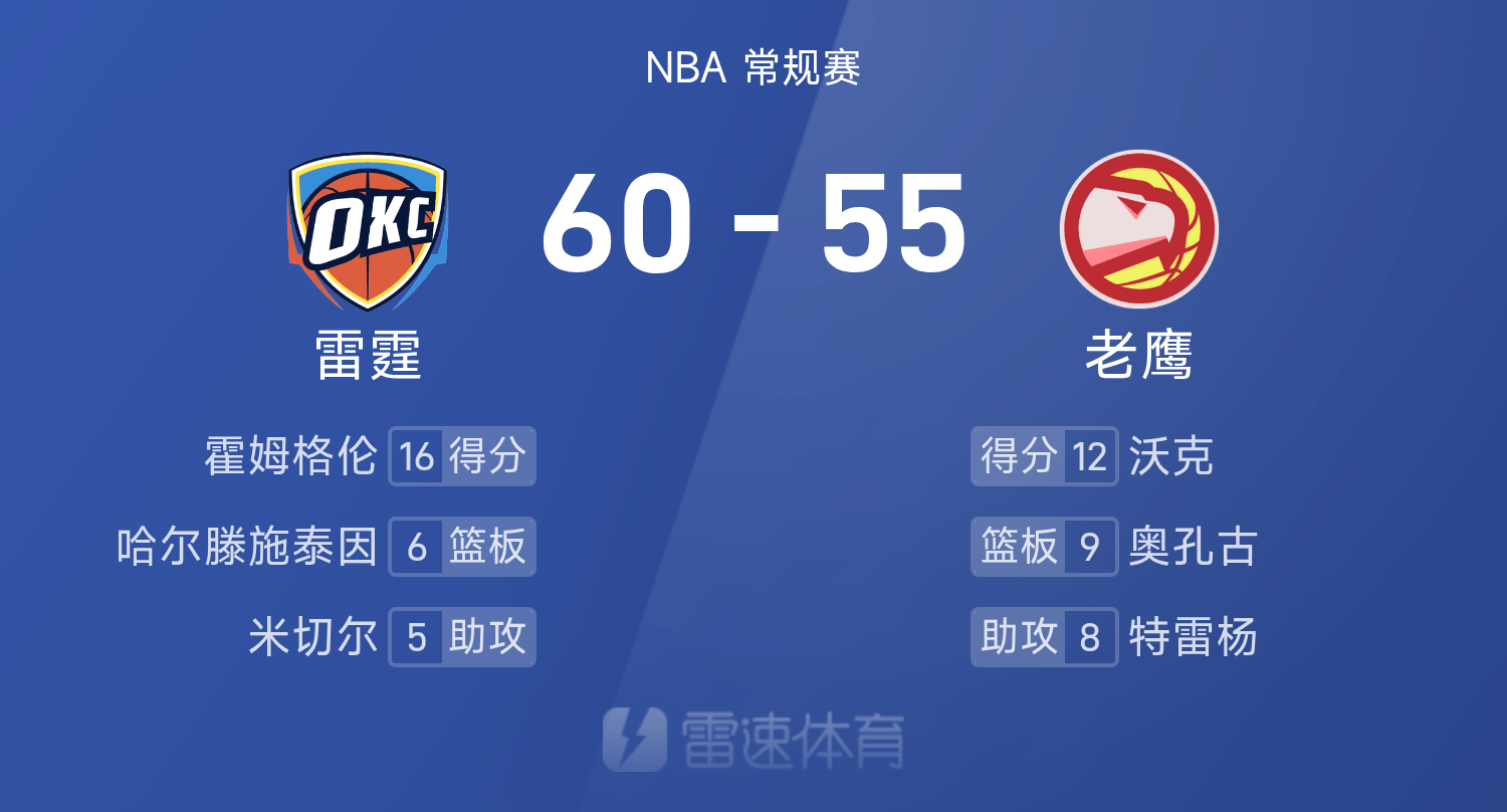 NBA半場:霍姆格倫16分,SGA13分4板,雷霆60-55領先位老鷹