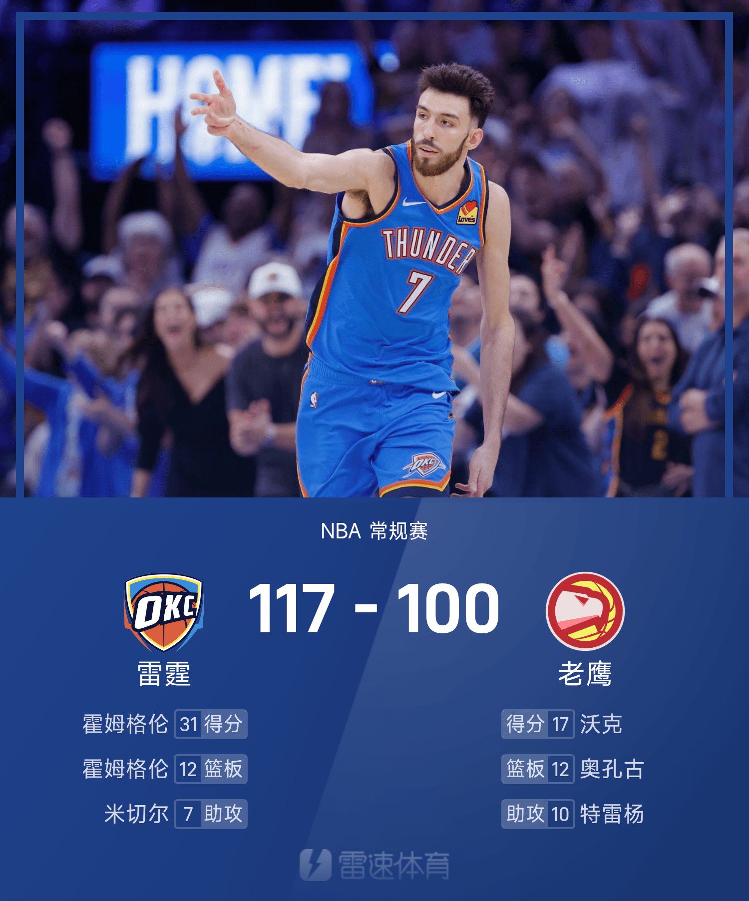 雷霆內線切特·霍姆格倫命中6記三分球球,得到31分12搶籃板3截球;雷霆核心亞歷山大僅憑4次罰球,即得到30分4搶籃板5助攻。雷霆以雙星閃耀表現,開季喜提三連勝。