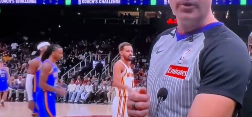 美媒曬出一段影片:特雷楊在雷霆挑戰勝利裁判宣布改判時,在裁判員身後對著裁判做出大拇指向下的動作表達不滿。