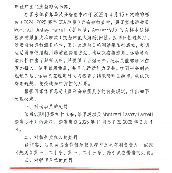 籃協:哈雷爾激動劑違規禁賽3個月,新疆承擔3.6萬檢測費