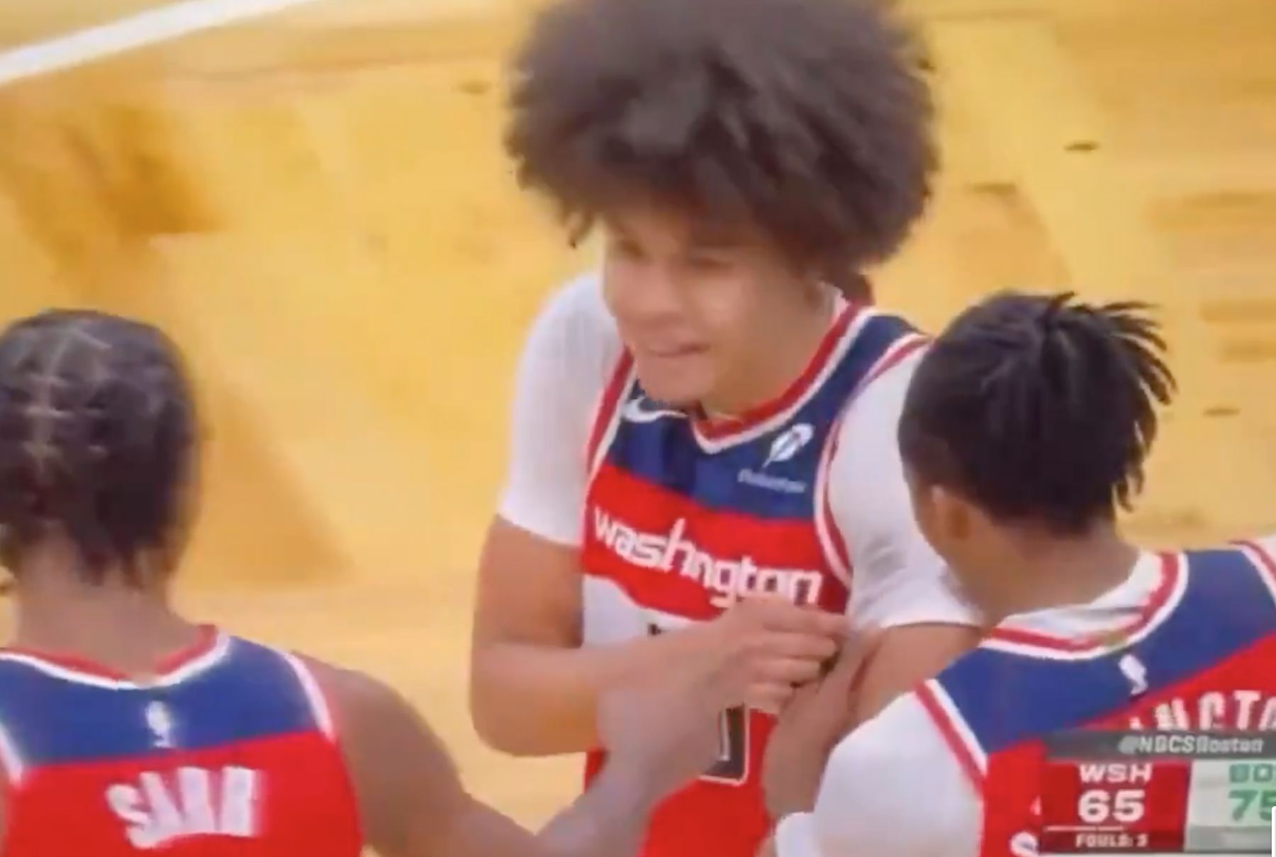值得一提的是,賽後美媒Basketball Forever曬出了本場競賽的一個小插曲:傑倫·布朗在一次攻擊中撞翻了凱肖恩·喬治,布朗的髮際線粉直接蹭到了喬治的白色緊身衣上。