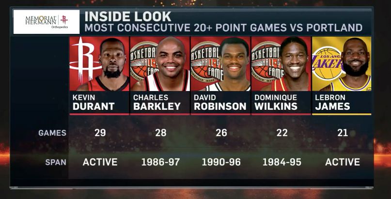 杜蘭特上半場競技狀態火熱,12投8中,拿下20分3搶籃板,這也是他面對拓荒者連續30場轟下20+得分。