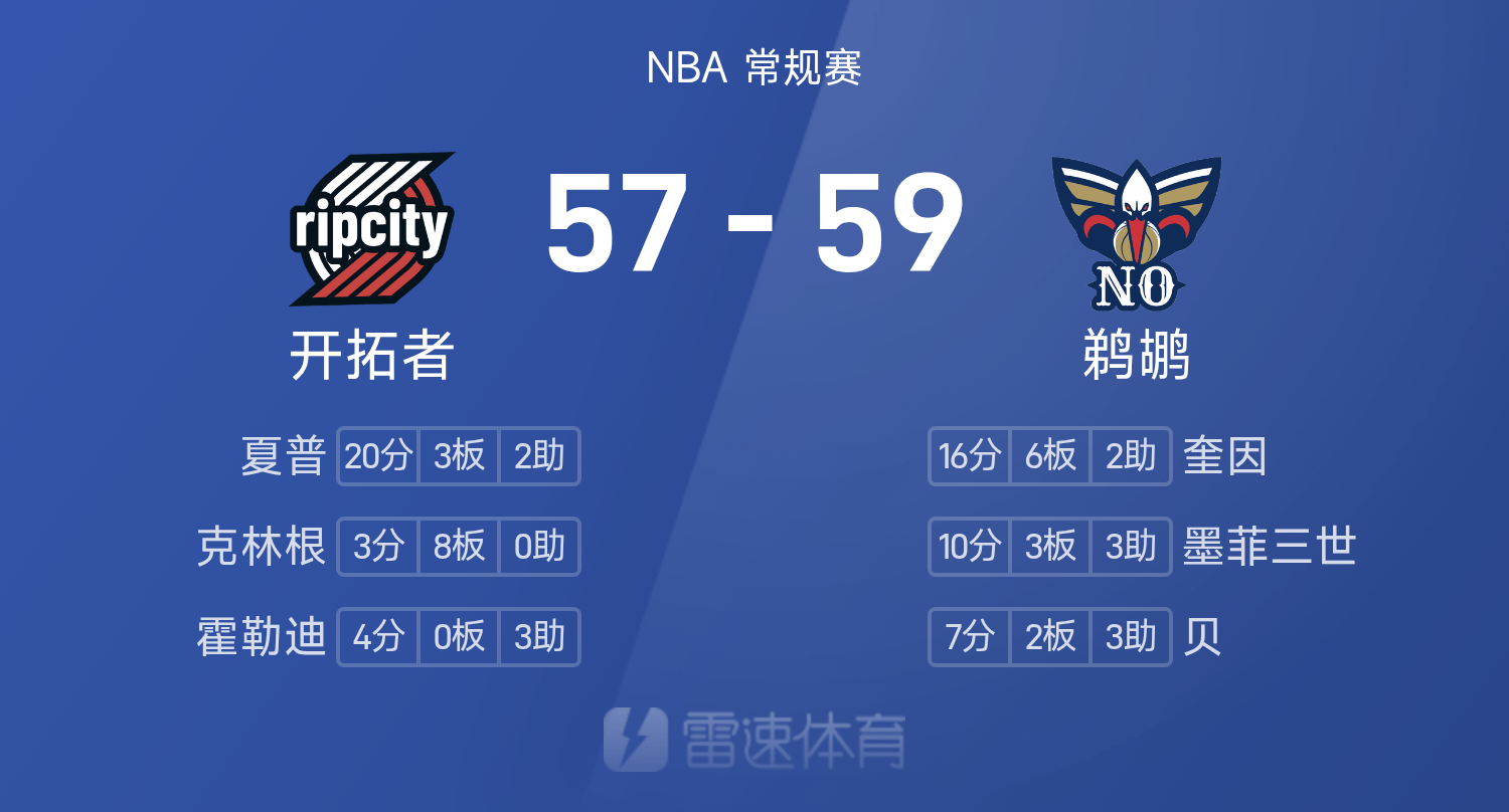 NBA半場:奎因16+6,楊瀚森暫未登場,拓荒者57-59鵜鶘