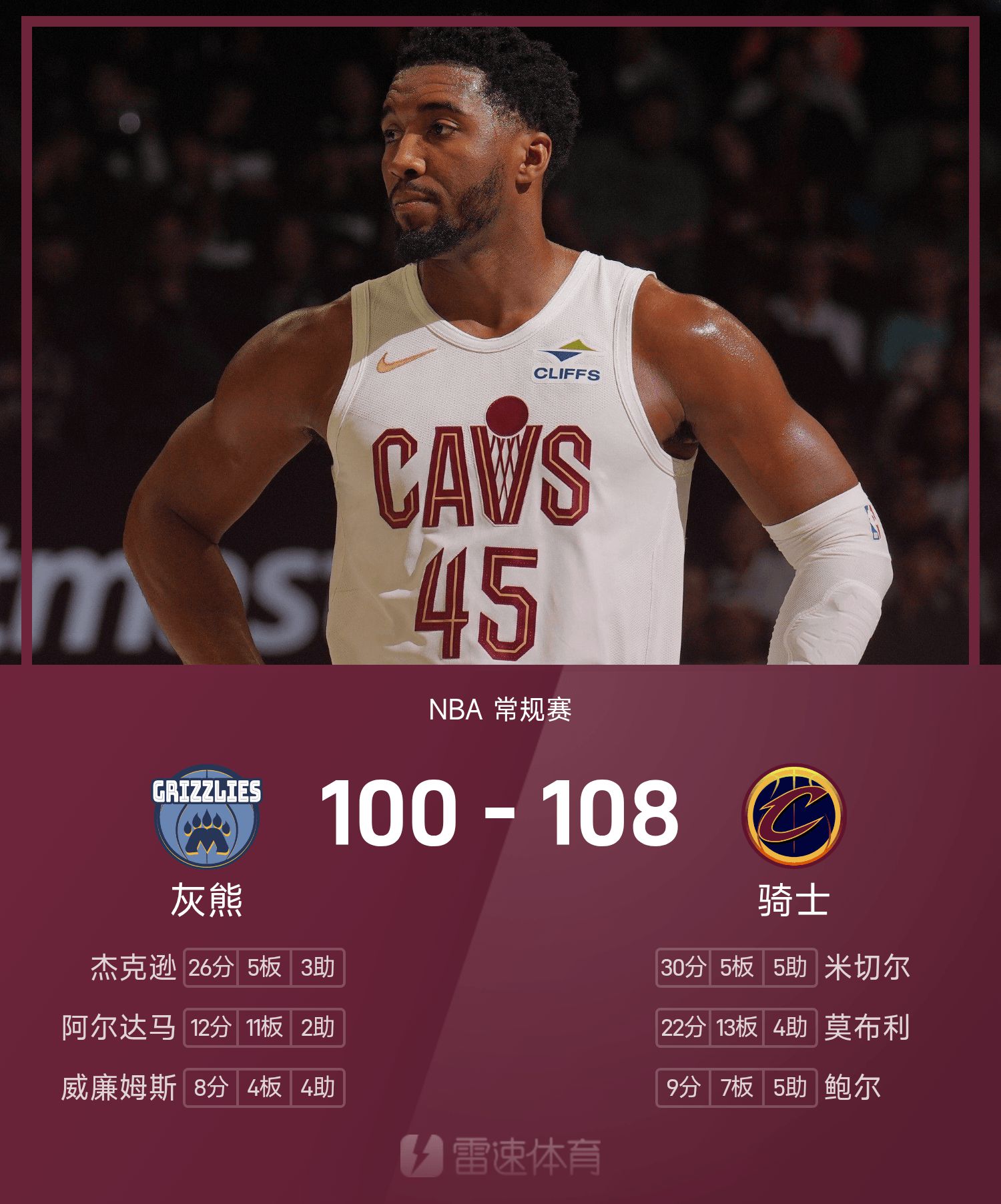 NBA戰報:米契爾30+5+5,騎士108-100逆轉灰熊