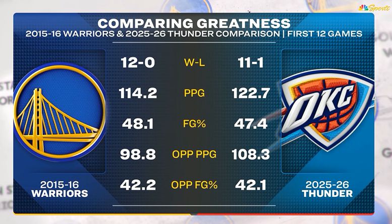 賽後,美國電視台比較本賽季雷霆和2015-16賽季勇士前12場競賽的數據: