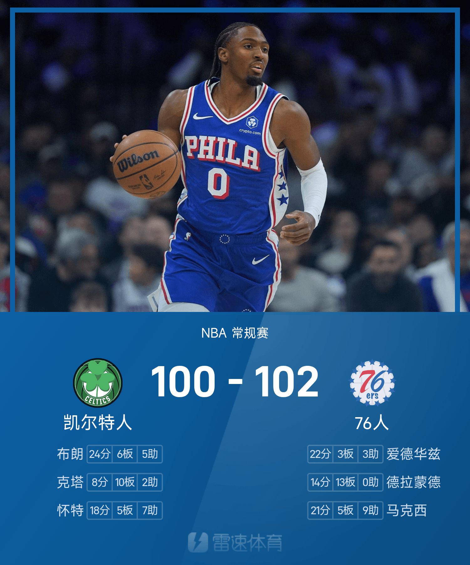 NBA戰報:馬克西21分9助攻,76人102-100險勝凱爾特人