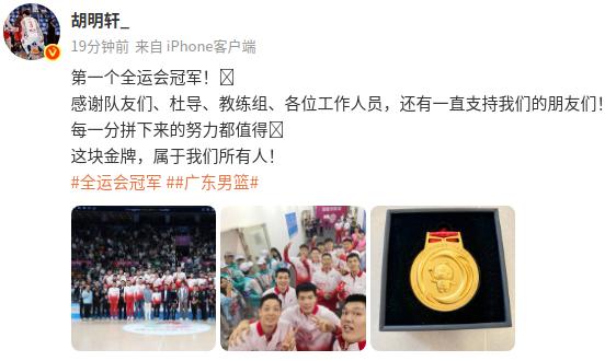 6686體育11月13日訊 全運男籃總決賽,廣東隊擊敗浙江隊,獲得冠軍,賽後,胡明軒在想發文。