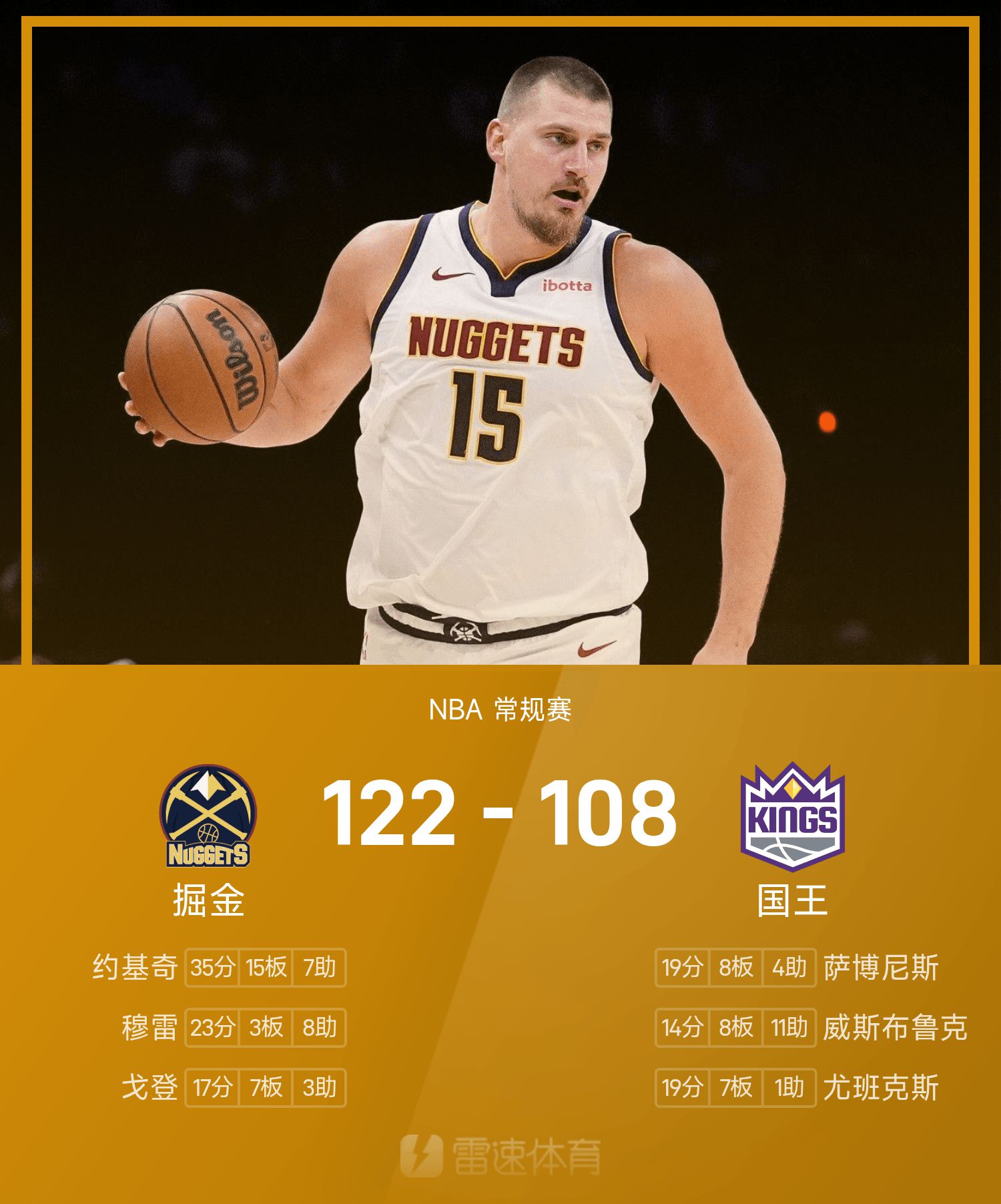 NBA戰報:約基奇35分15板7助,金塊122-108擊敗國王