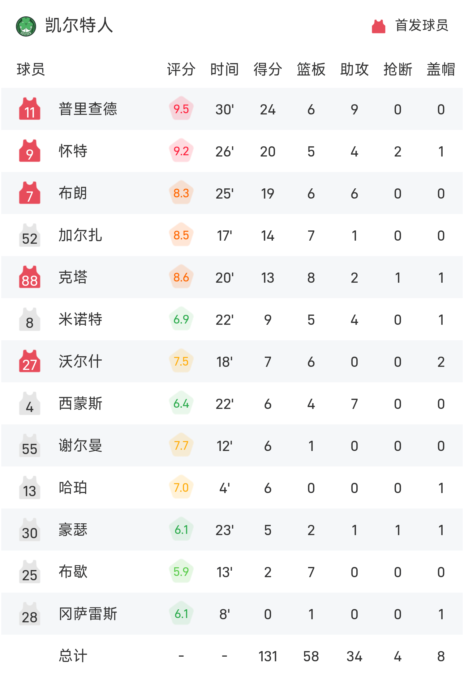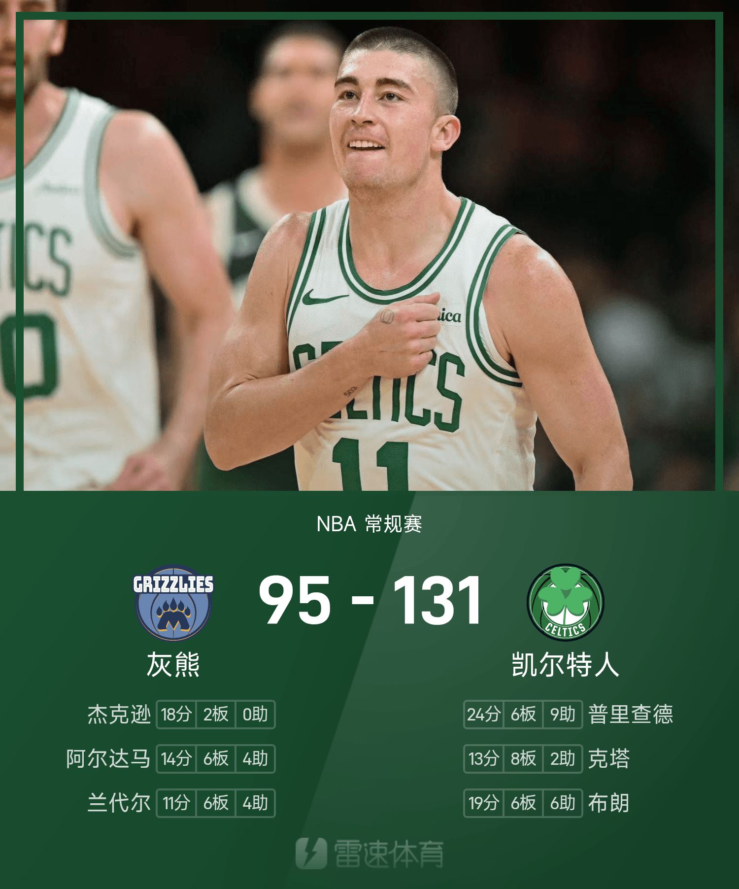 雙方全場戰罷,塞爾提克131-95擊敗灰熊。