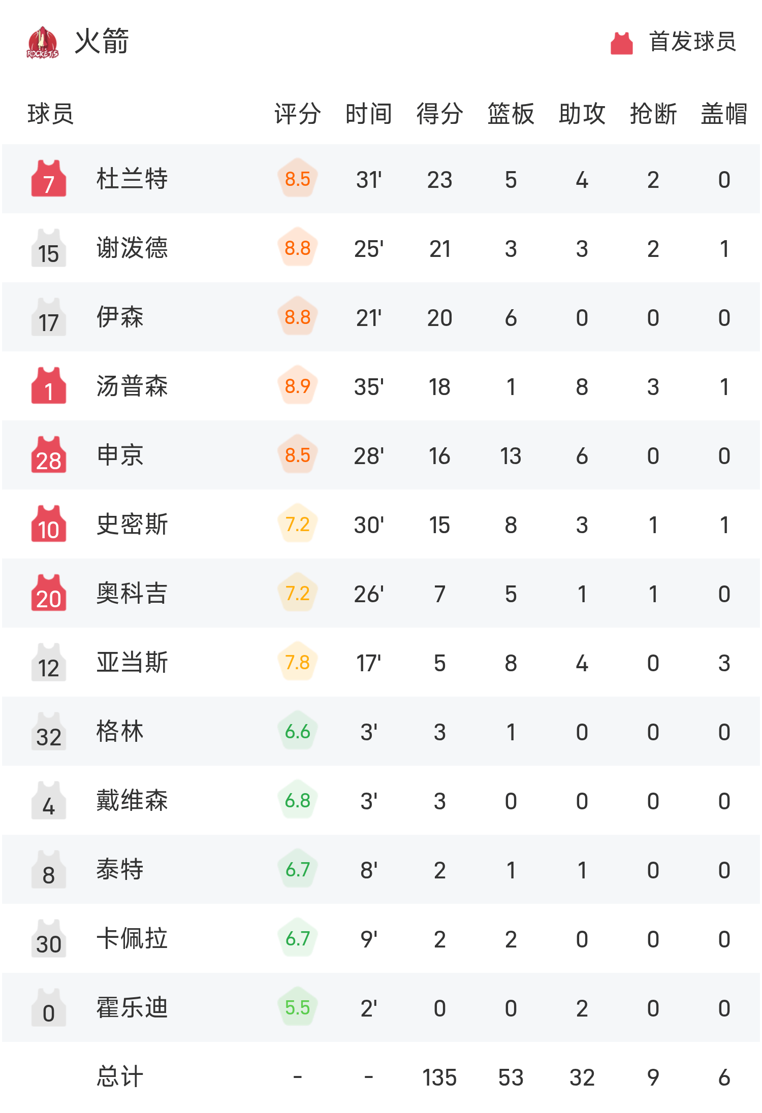 雙方全場戰罷,火箭135-112擊敗巫師。