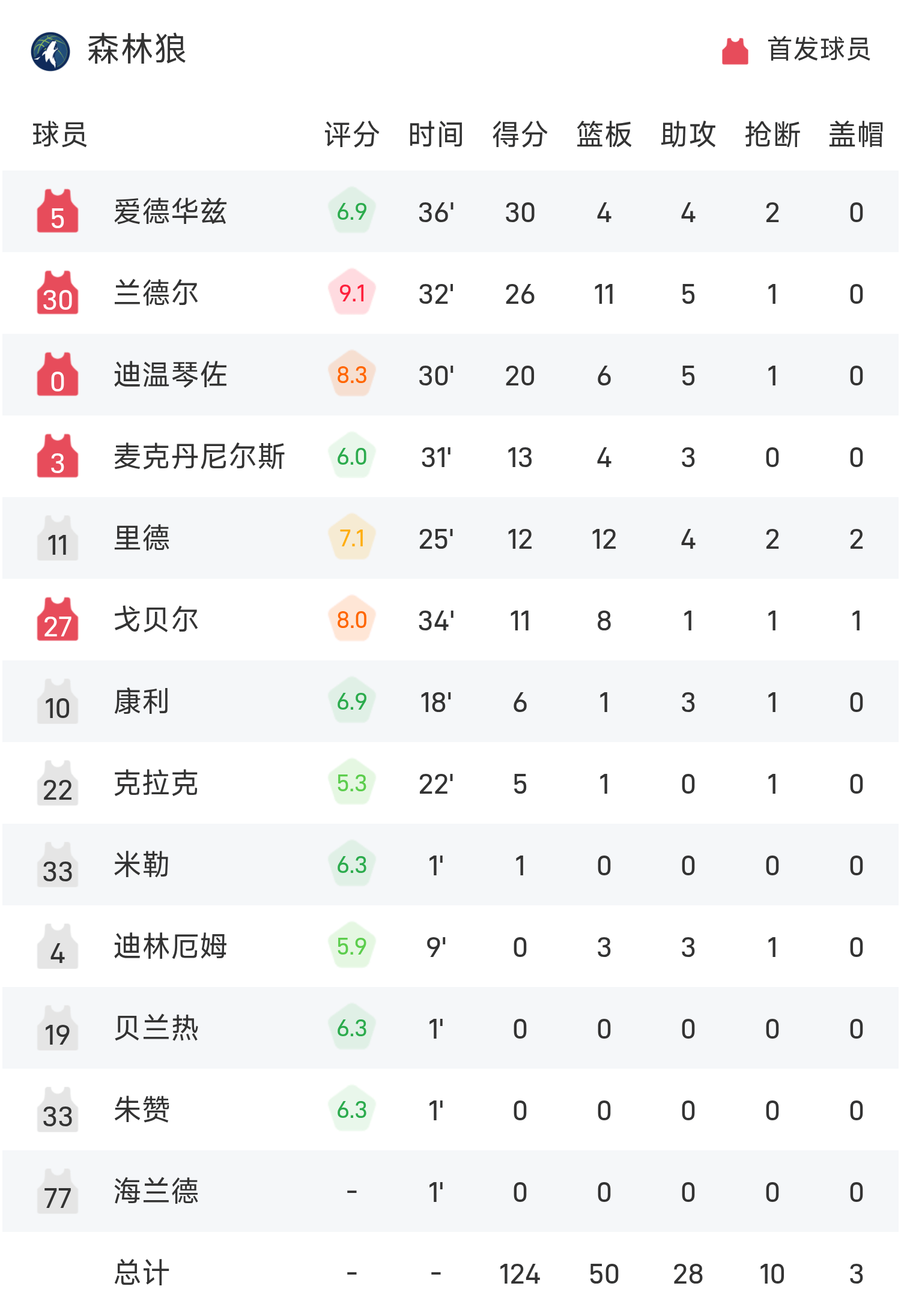 雙方全場戰罷,灰狼124-110戰勝國王。