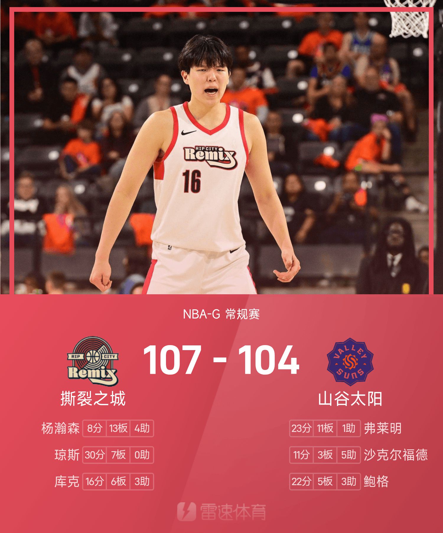 G聯賽事戰報:楊瀚森8分13板,撕裂之城107-104險勝山谷太陽