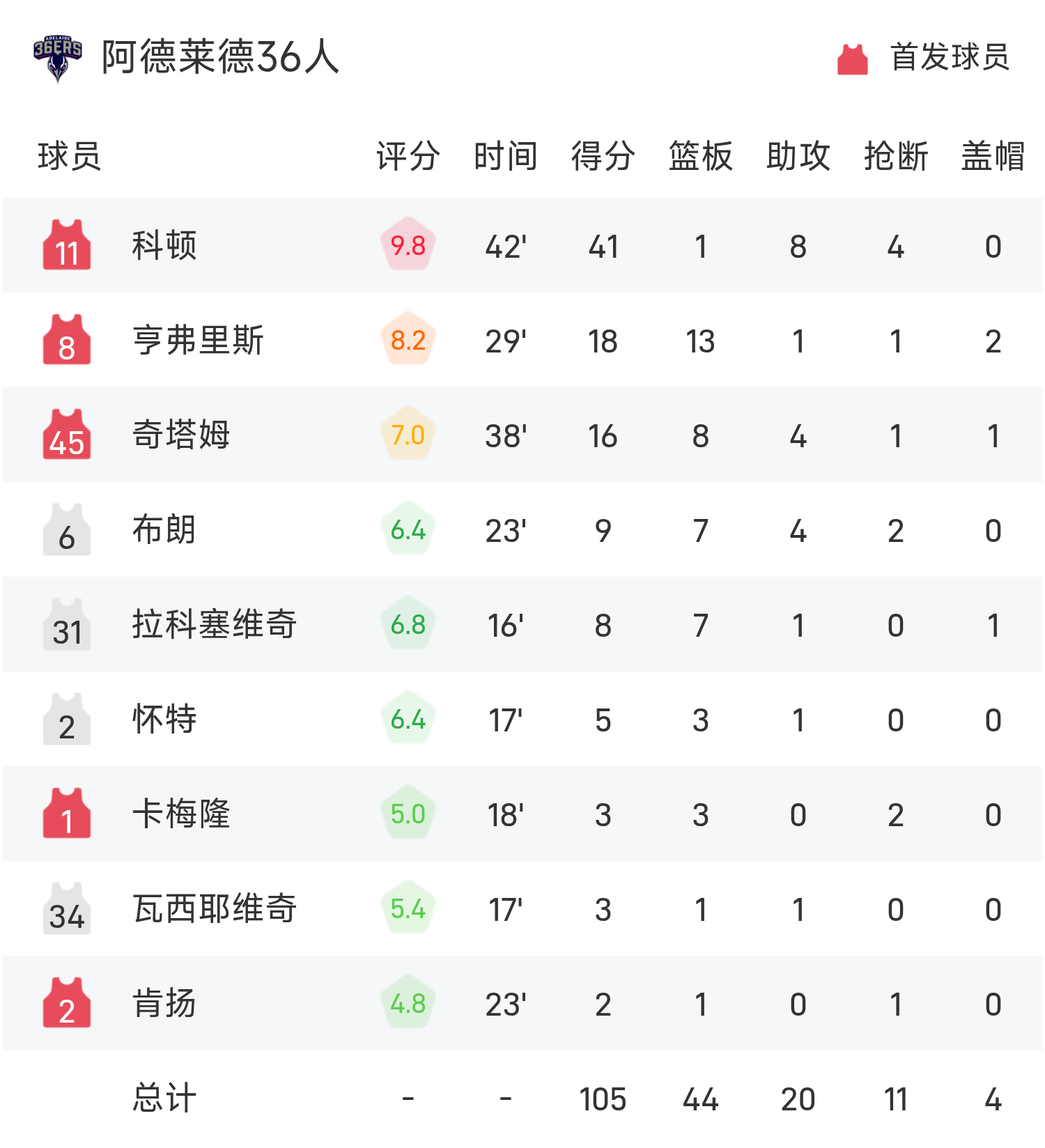 柯頓砍下全場最高的41分1板8助,率領阿德雷德36人勝利取勝。