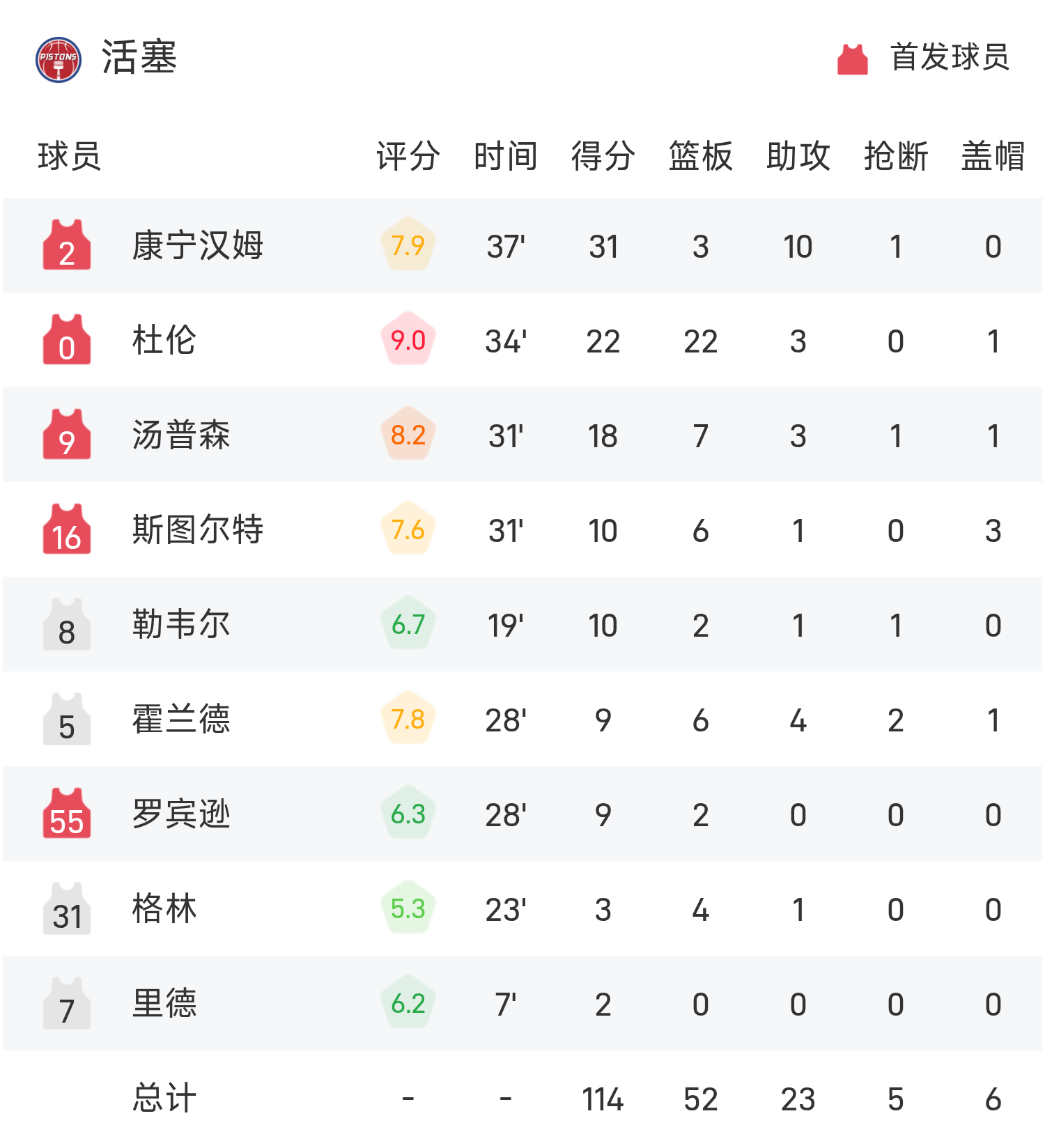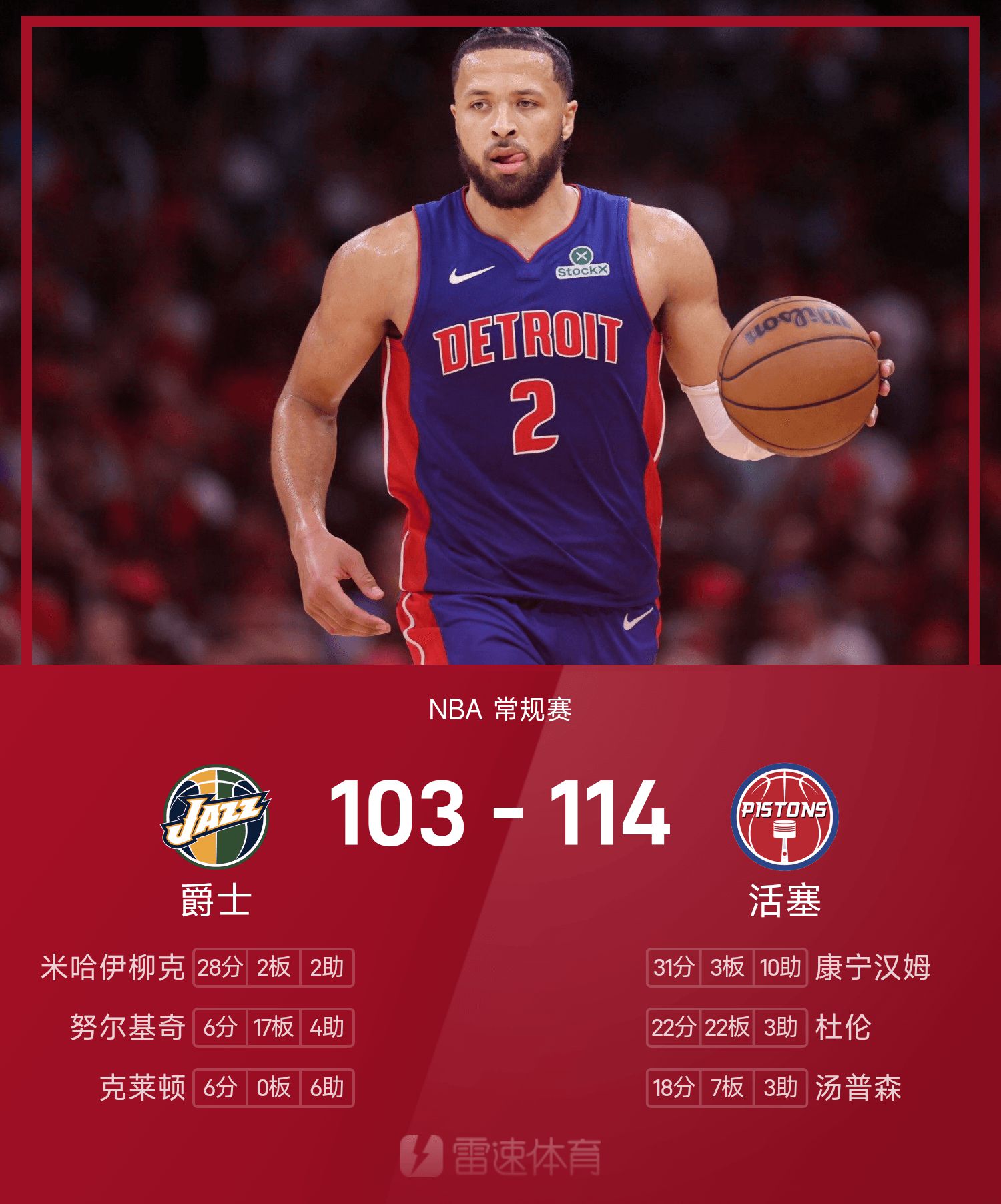 NBA戰報:康寧漢姆31分10助,活塞114-103爵士