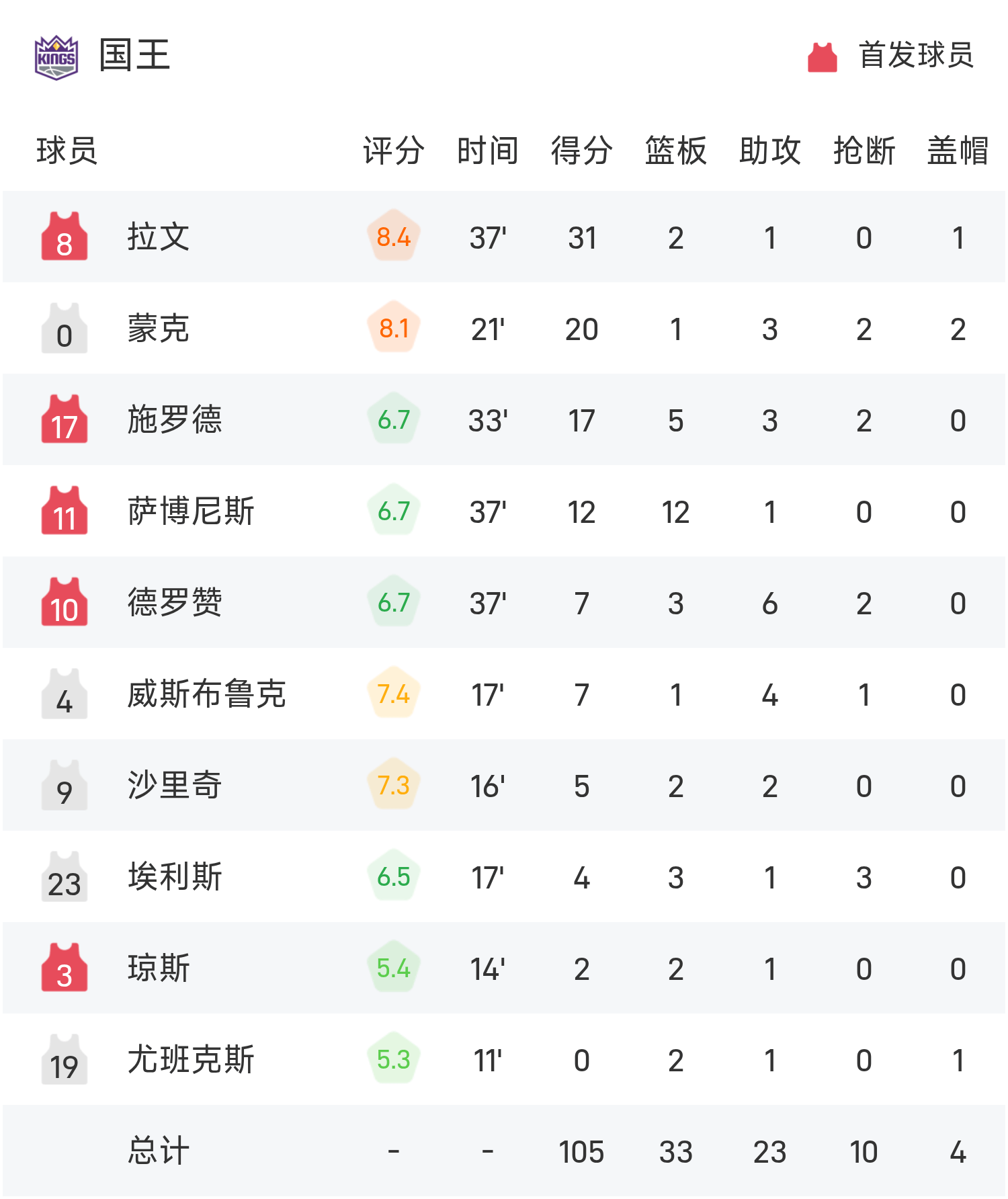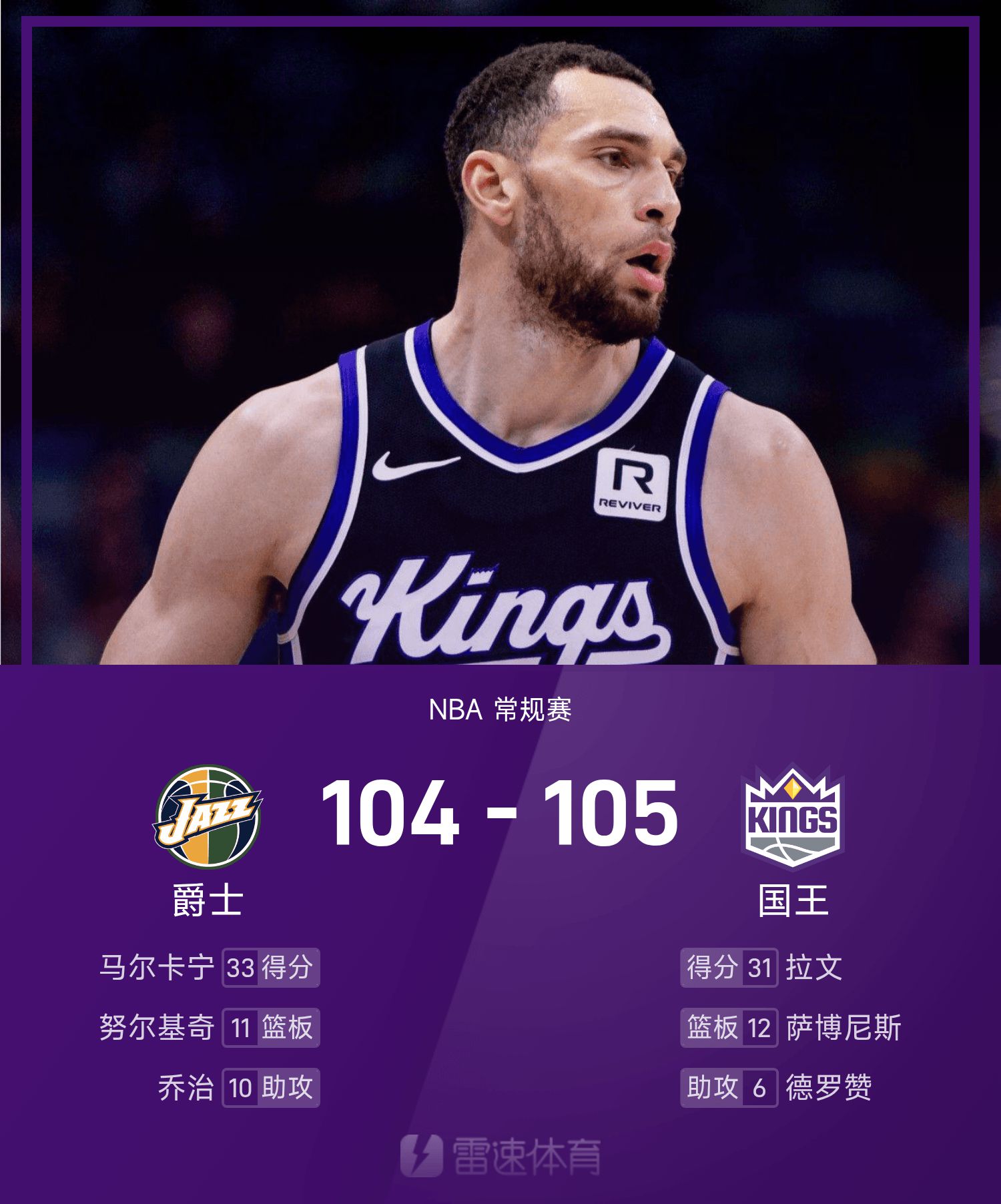 NBA戰報:拉文31分,國王105-104險勝爵士