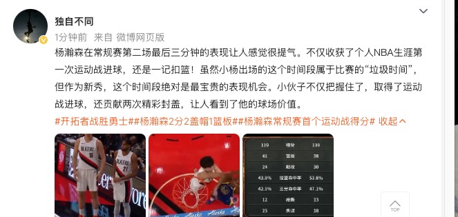 楊瀚森在例行賽第二場最後三分球鐘的表現讓人感覺很提氣。不僅收穫了個人NBA生涯第一次運動戰進球,還是一記灌籃!雖然小楊出場的這個時段屬於競賽的“垃圾時間”,但作為新隊員,這個時段絕對是最寶貴的表現機會。小伙子不僅把握住了,取得了運動戰進球,還貢獻兩次精彩封蓋,讓人看到了他的比賽場價值。