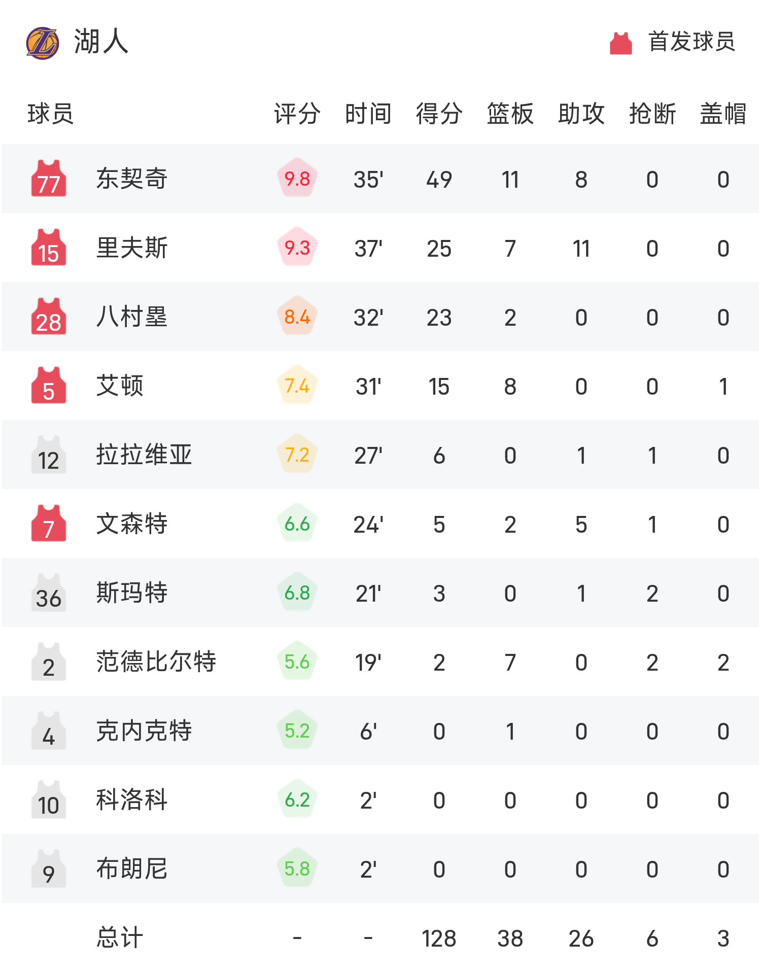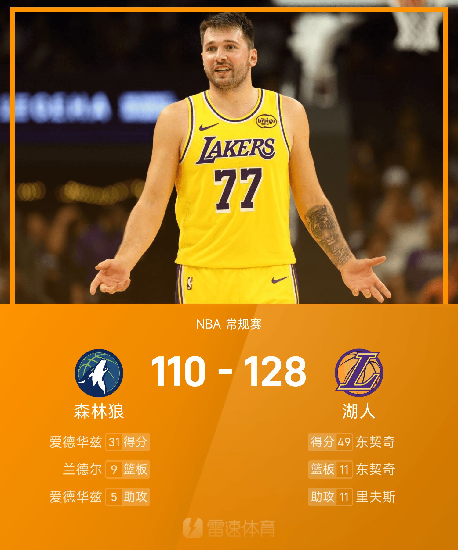 NBA戰報:東契奇49分11板8助,湖人128-110輕取森林狼