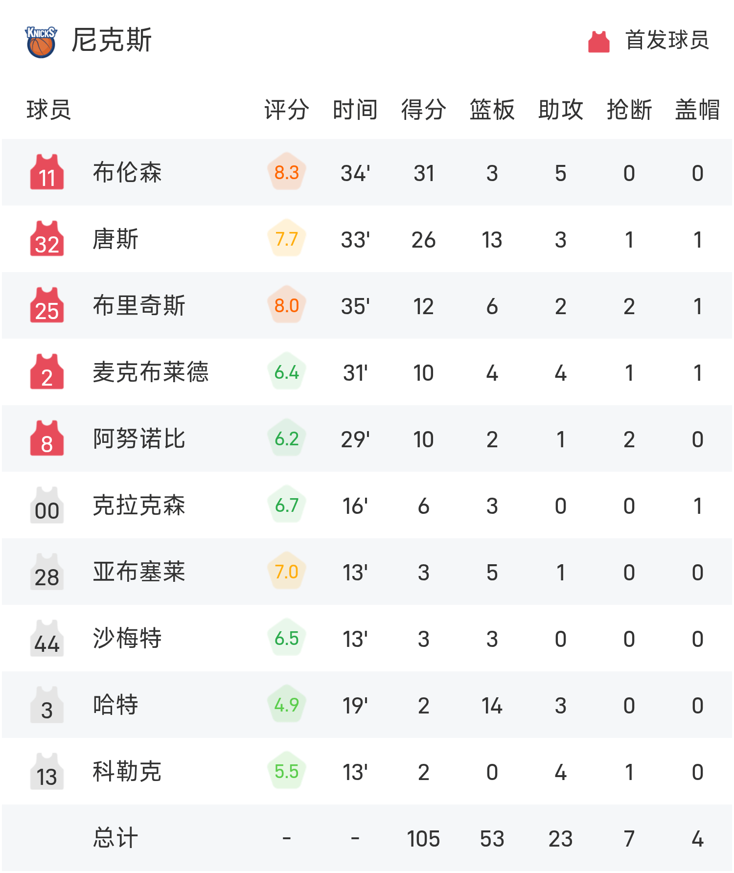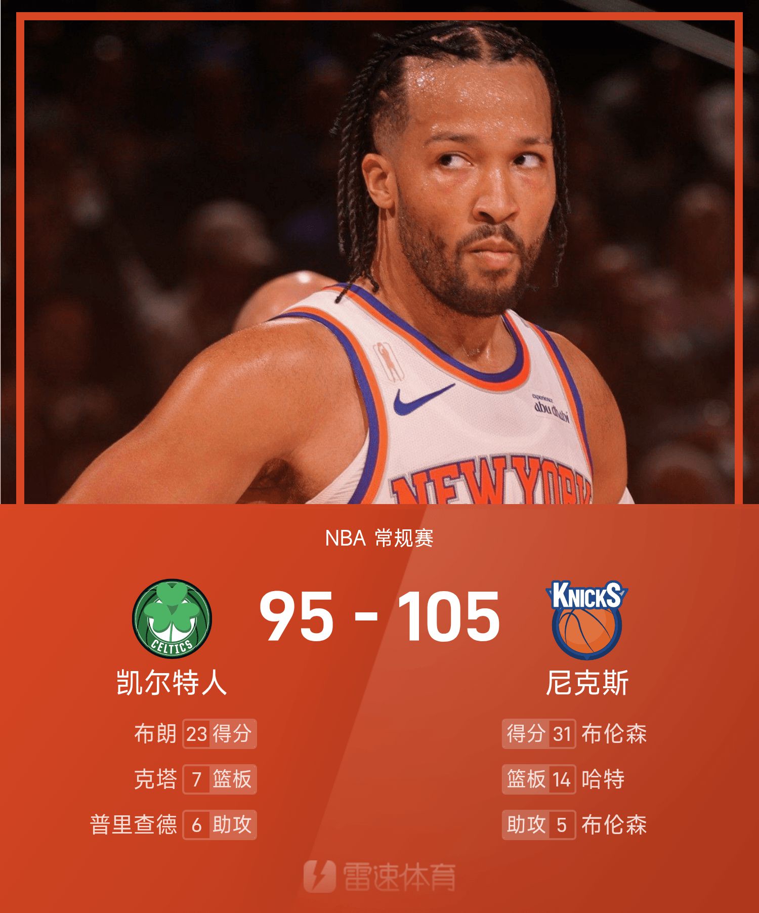 NBA戰報:布倫森31分,唐斯26+13,尼克105-95凱爾特人