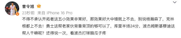 不得不承認開拓者這五小效果非常好,那效果好大五號位就上不去,別說楊瀚森了,克林根都上不去!勇士這群老傢伙背靠背頂的夠可以了,庫裡半場24分,波傑姆斯基、穆迪這群人幹嘛呢?還要說一次,看波傑打球腦瓜子痛