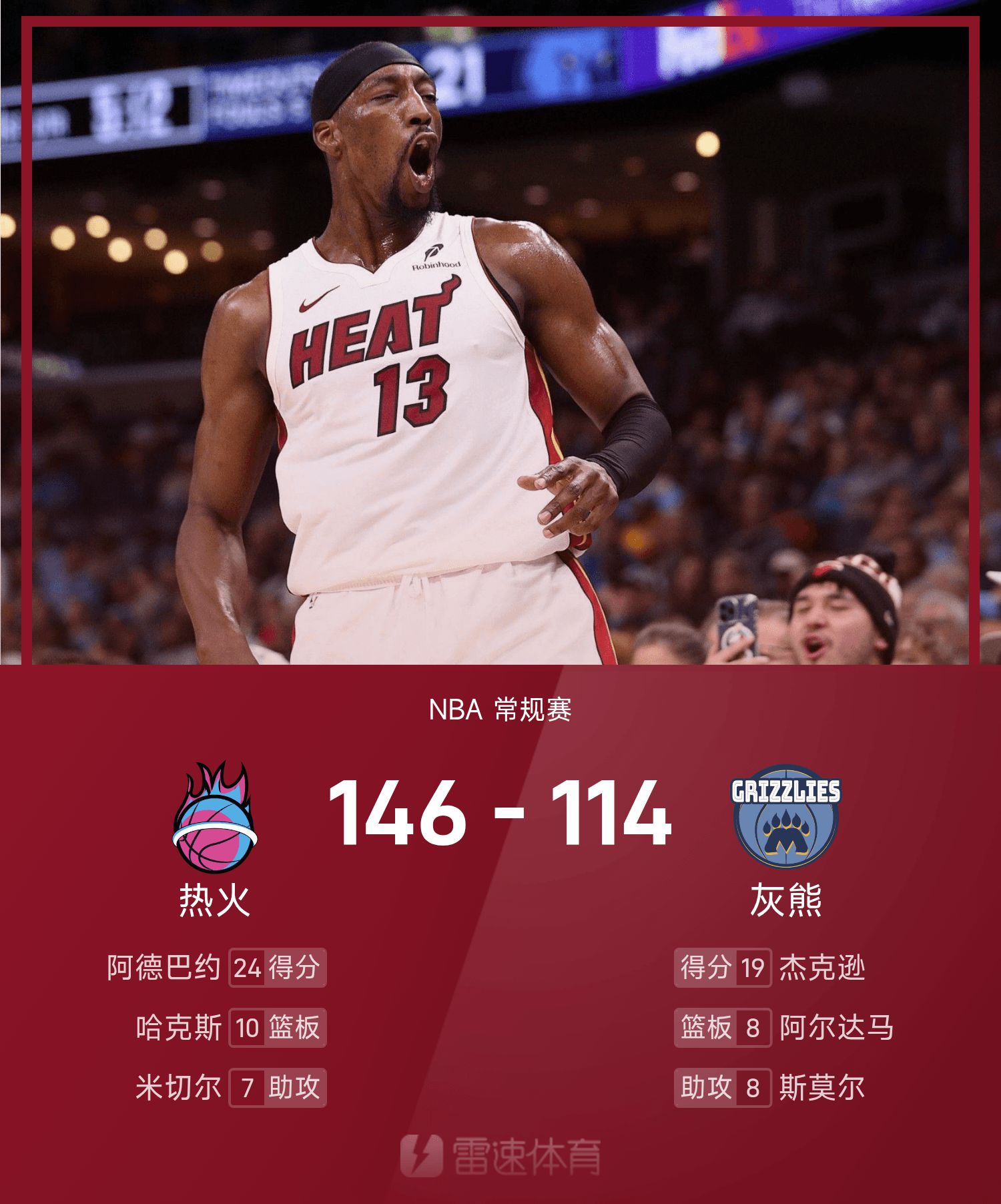 NBA戰報:阿德巴約24分,熱火146-114狂勝灰熊